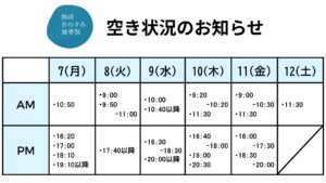 いつも当院をご利用いただきありがとうございます。 7/7(月)~7/12(土)の空き状況のお知らせです。 画像以外のお時間でもご案内できる可能性がございますので、お気軽にご相談くださいませ(^^)