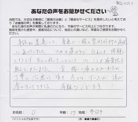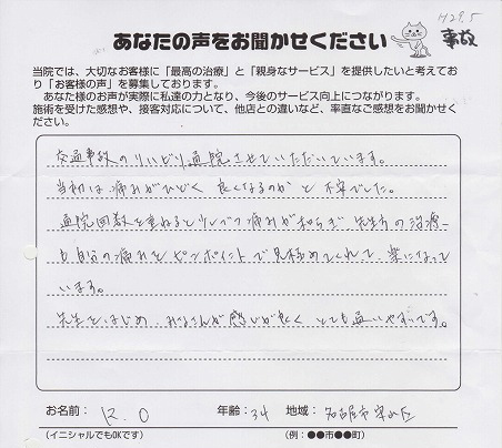 まだ、首や肩に不安があるので、これからも治療をよろしくお願いします。