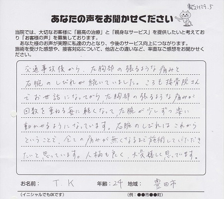 交通事故後から、左胸部の張るような痛みと、右腕のしびれが続いていました。