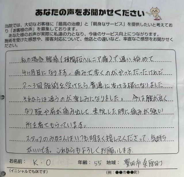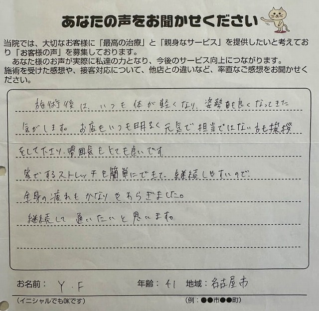 治療していただき、良くなっていくのを実感いたしました。ありがとうございます。