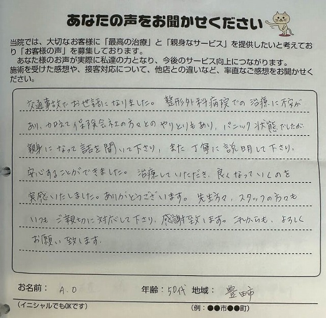整形外科病院での治療に不安があり、加えて保険会社の方々とのやりとりもあり、パニック状態でしたが、親身になって話を聞いて下さり、また丁寧に説明して下さり、安心することが出来ました。
