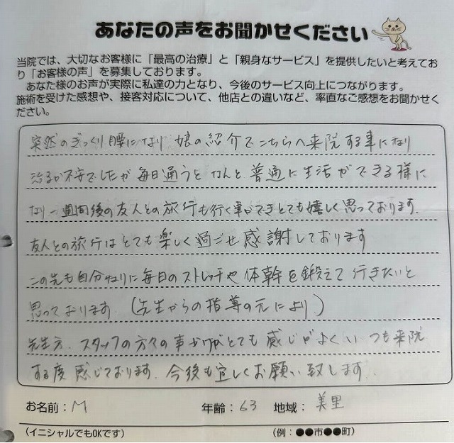 突然のぎっくり腰になり、娘の紹介でこちらへ来院する事になり、治るか不安でしたが、毎日通うとなんと普通に生活できる様になり、一週間後の友人との旅行も行く事ができとても嬉しく思っております。